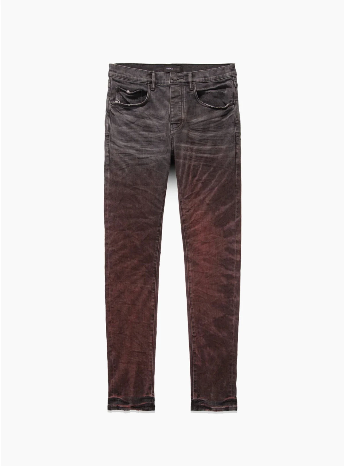 Crafted from premium stretch denim, this classic low rise skinny comes in a dark wash with crinkling, whiskering and a spiraling red tie-dye effect. The style is detailed with bar-tack stitching and hidden rivets for added durability, a button fly closure, chambray lining for a more comfortable fit, a custom Purple cowhide leather patch and signature hang tag branding.