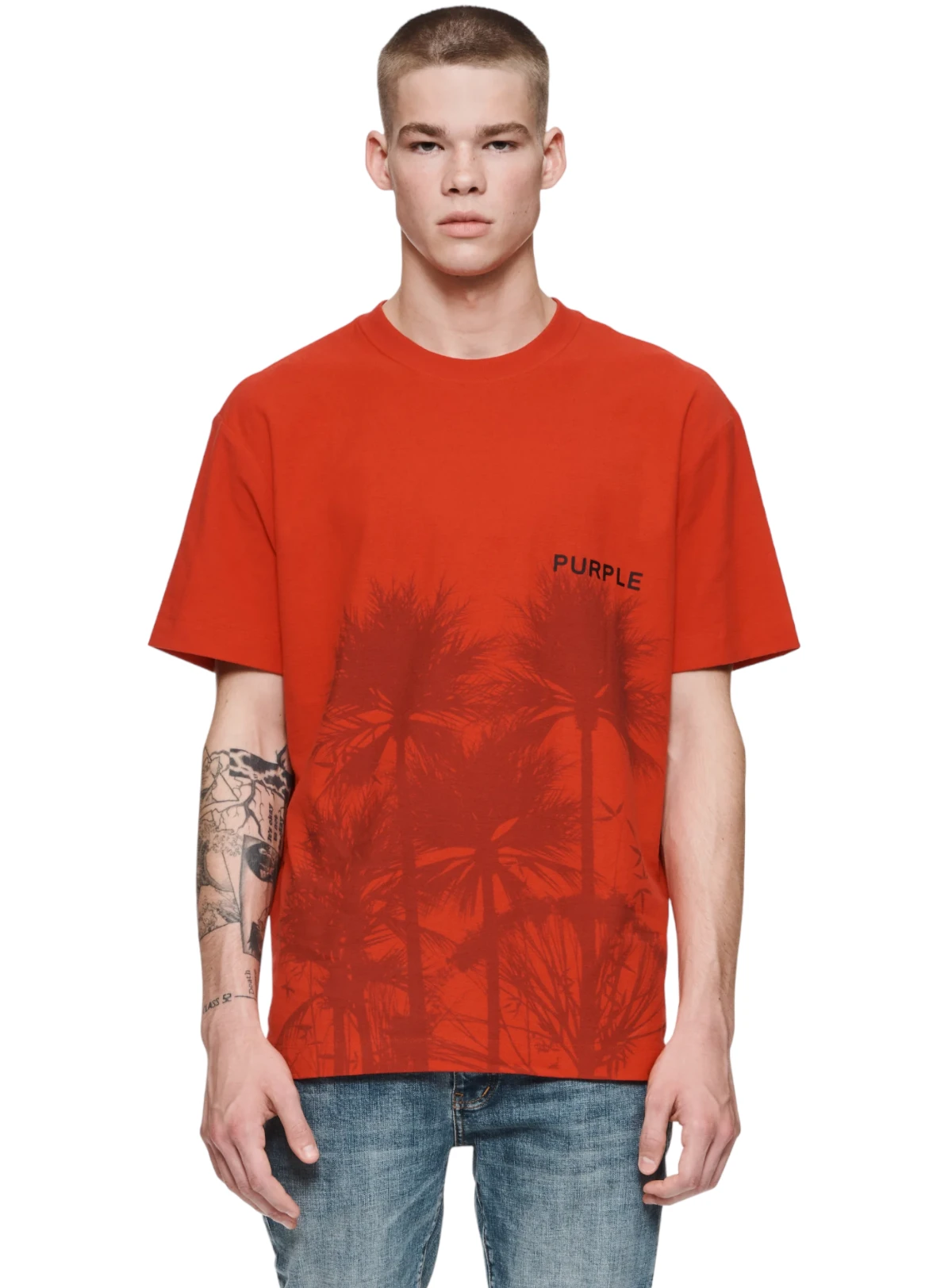 This short-sleeved tee is a premium red jersey knit cut from 100% cotton. The midweight design is printed with palm tree silhouettes as well as Purple Brand detailing at the chest. It’s tailored for a regular fit for elevated comfort and comes finished with an inset crewneck collar.